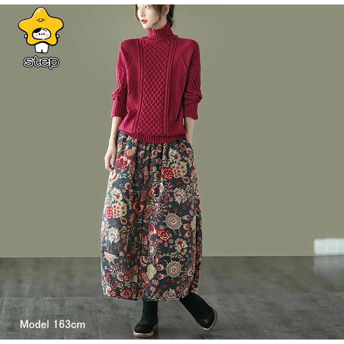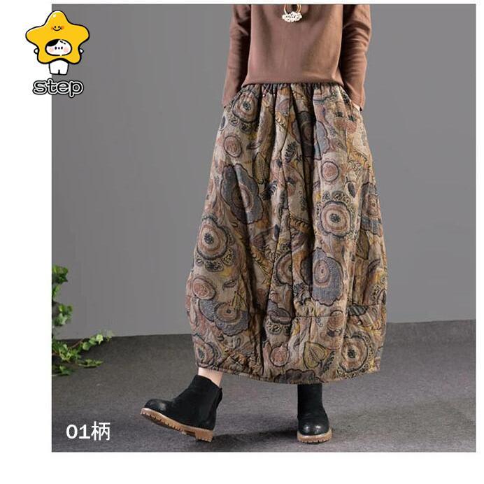 スカート ロングスカート コクーンスカート 花柄 フレア 中綿 ボトムス レディース 大きいサイズ 体型カバー 冬 ウエストゴム ロング丈 秋冬