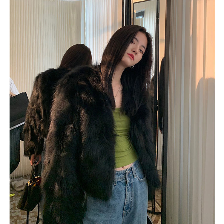 韓国ファッション アウターウェア 2024新型ファッションVネックセレブ痩せ見えショート丈キツネの毛皮を模した草コート