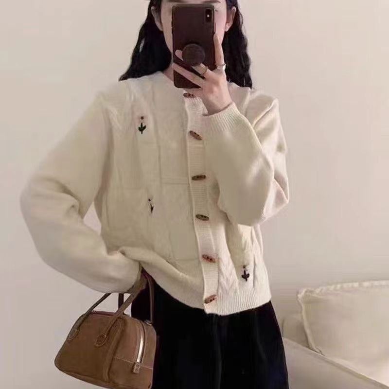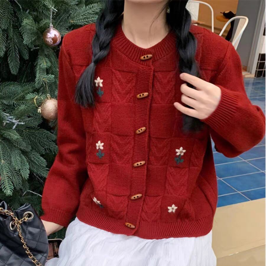 クリスマス ニットカーディガン 韓国ファッション 赤いクリスマスセーターカーディガン秋冬新作甘めデザイン感刺繍ニットコート
