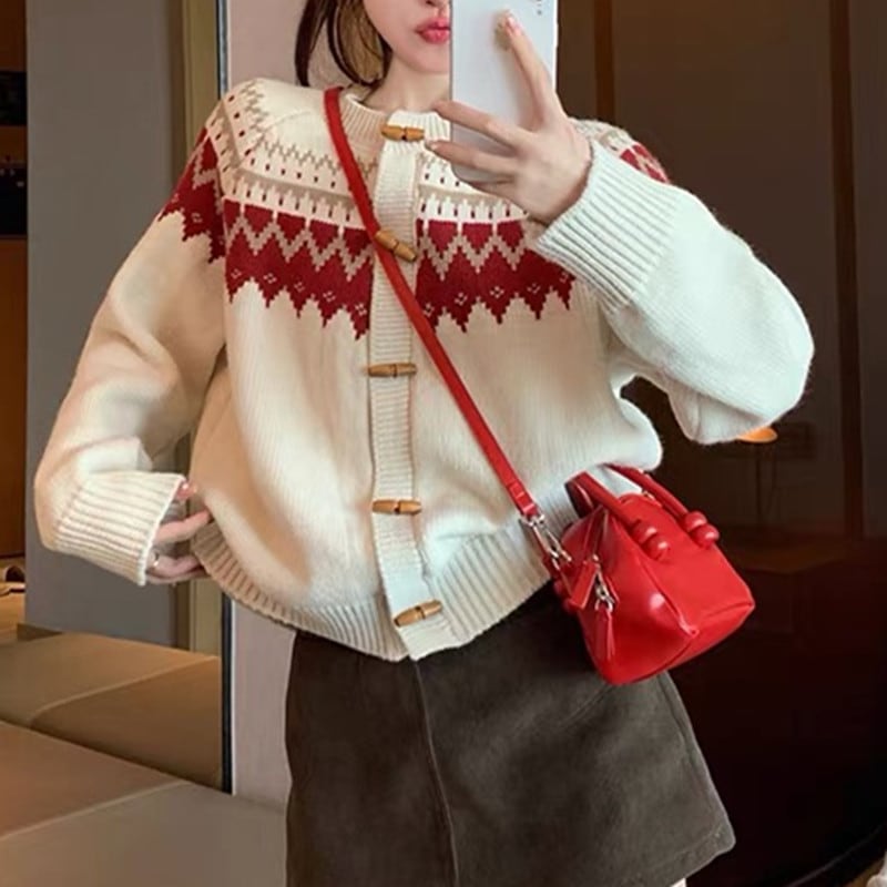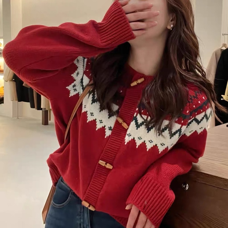 秋 冬 レディースファッション ベーシックニット クリスマス レトロヒットカラージャンパーコート女性 木製カウルボタン 赤 ニットトップス ニットセーター ニット長袖