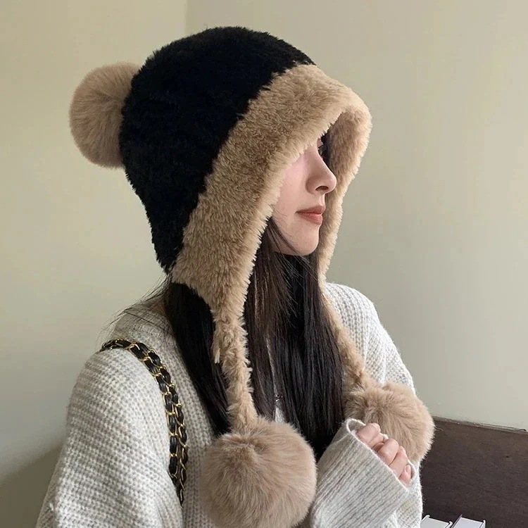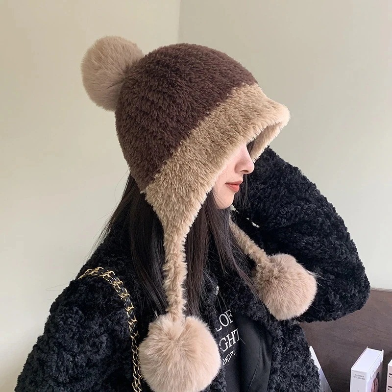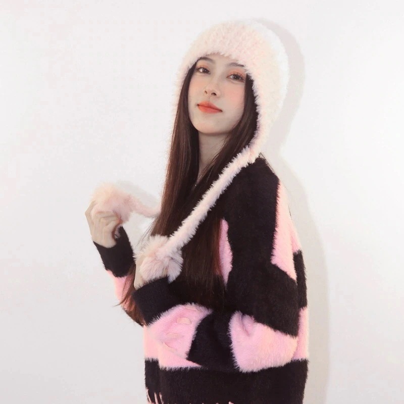 秋 冬 キャップ特集 ニット帽 レディースファッション ぶつかり色猫耳モコモコ カジュアル可愛い毛玉系保温耳保護 ニット 帽子 クリスマス 韓国 女優帽 暖かい