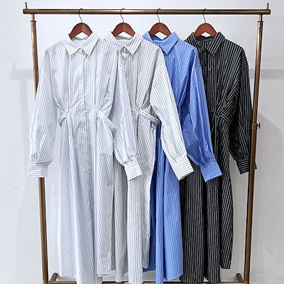 ストライプ ウエストタック シャツ ワンピース レディース 【 送料無料 】 ロング丈 マキシ丈 ワンピ バックリボン 春服 きれい 大人 かわいい ママ カジュアル OL シンプル ファッション