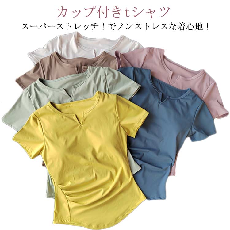 カップ付きtシャツ レディース 半袖 スポーツ ヨガウェア ルームウェア スーパーストレッチ 部屋着 パッド付き 吸汗 速乾 通気 薄手 快適 伸縮性 締め付けない ジム 運動 フィットネス スポーツ