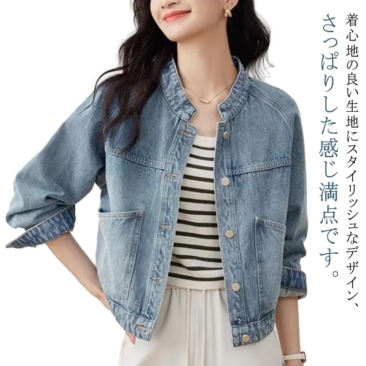 ノーカラー デニムジャケット レディース 長袖 ジャケット 春 秋 Gジャン ショート丈 防風 防寒 快適 きれいめ シルエット 着回し ジージャン カジュアル 普段着 大きいサイズ レトロ