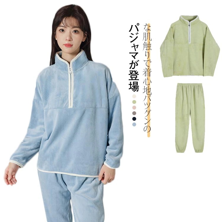 パジャマ レディース メンズ ルームウェア 上下セット マイクロファイバー フリース 長袖 部屋着 プルオーバー ハーフジップ パンツ ゆったり もこもこ ふわふわ あったか 無地 セットアップ シン