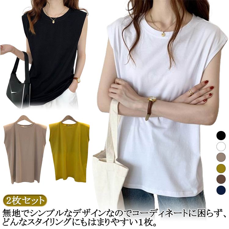 2枚セット フレンチスリーブ Tシャツ レディース タンクトップ キャミソール ロンT クルーネック トップス インナー ノースリーブ 無地 インナーシャツ カットソー 袖なし 体型カバー ゆったり