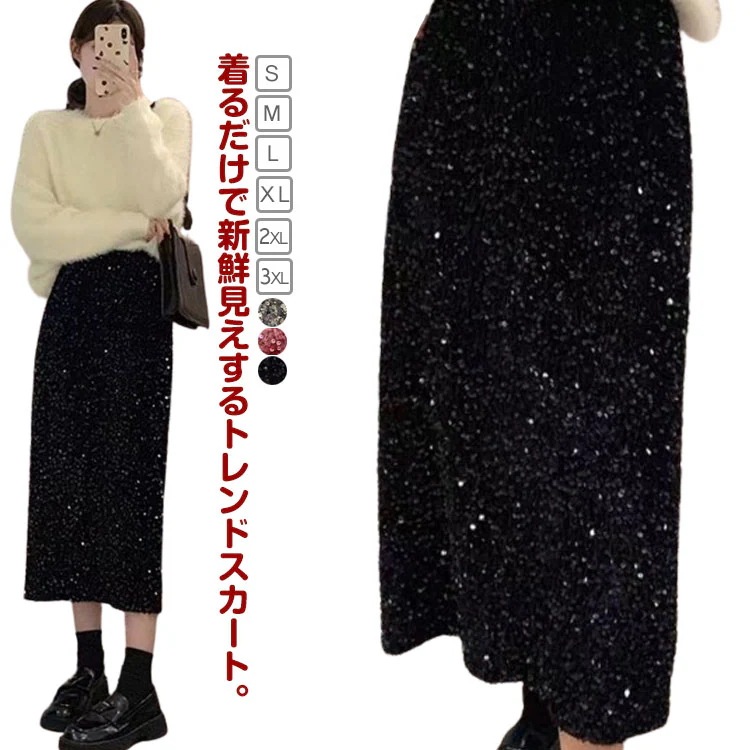 スパンコールスカート タイトスカート スリット ナロースカート 春秋冬 スカート Iラインスカート ボトムス ロング丈 ハイウエスト ウエストゴム 光沢 大人 カジュアル パーティー お出かけ 韓国