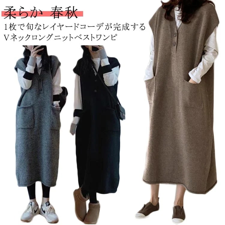 ニットワンピース レディース ニットベストワンピース Vネック ロング 体型カバー レイヤード ポケット付き トップス セーター 重ね着 カジュアル 春 秋 冬