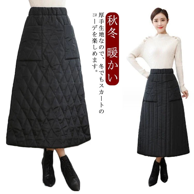 スカート レディース ポケット付き ウエストゴム ダウン風スカート キルティングスカート 厚手 ストレートフレアスカート Aライン 秋冬 暖かい 保温 防寒対策 中綿スカート ミモレ丈 シンプル カジ