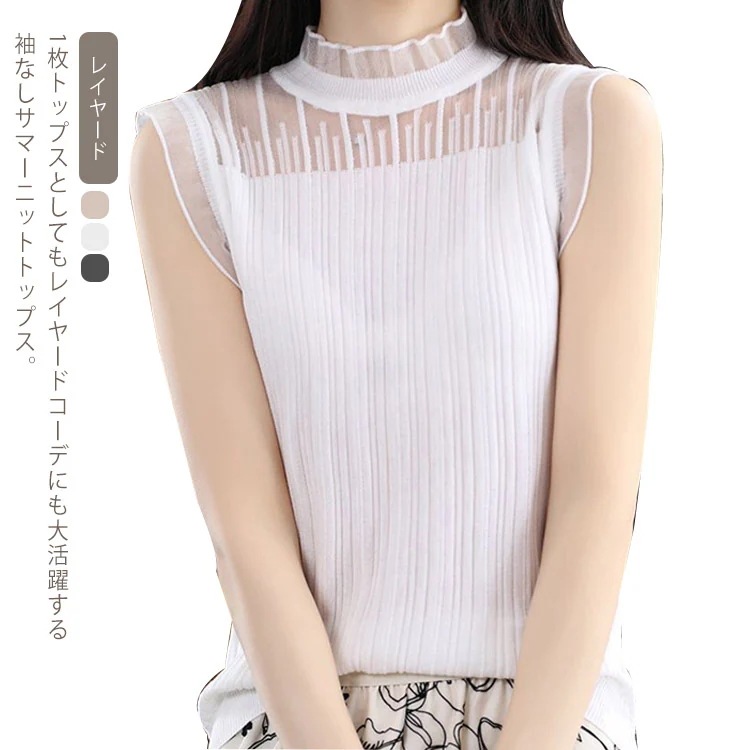フリル襟 サマーニット タンクトップ ノースリーブ トップス ハイネック レディース 薄手 インナー 送料無料 レース 重ね着 レイヤード 夏服 春夏 軽量 首元隠し きれいめ エレガント