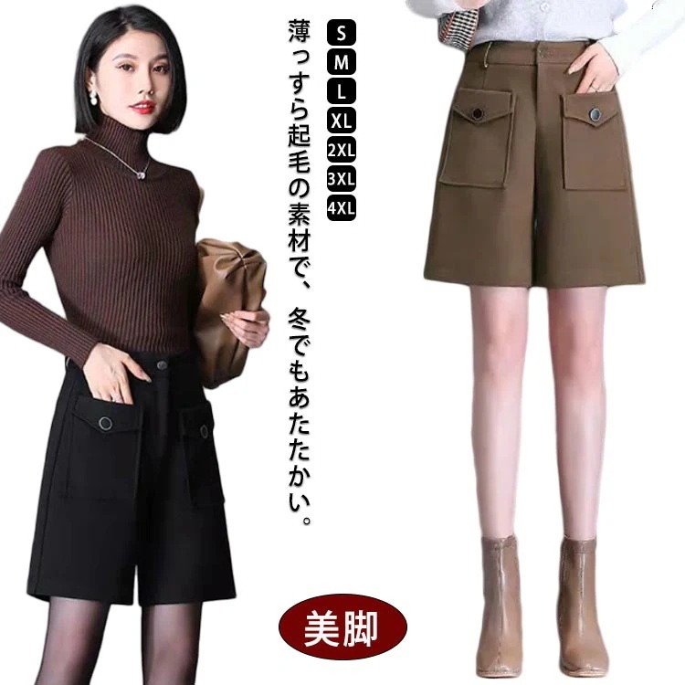 ショートパンツ 秋冬 レディース ウールタッチ 膝上丈パンツ ウール調 Aライン 五分丈 ハーフパンツ 美脚 キュロットパンツ 短パン キレイめ カジュアル ゆったり ハイウエスト 着痩せ ブラック