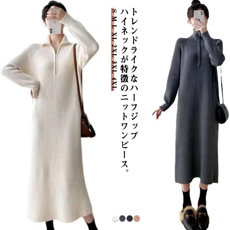 ニットワンピース ハイネック ハーフジップワンピース ニット ロング丈 ロングワンピース リブニット セーター 長袖 ゆる ニット ワンピース ミモレ丈 ロング丈 Iライン ゆったり 体型カバー 秋
