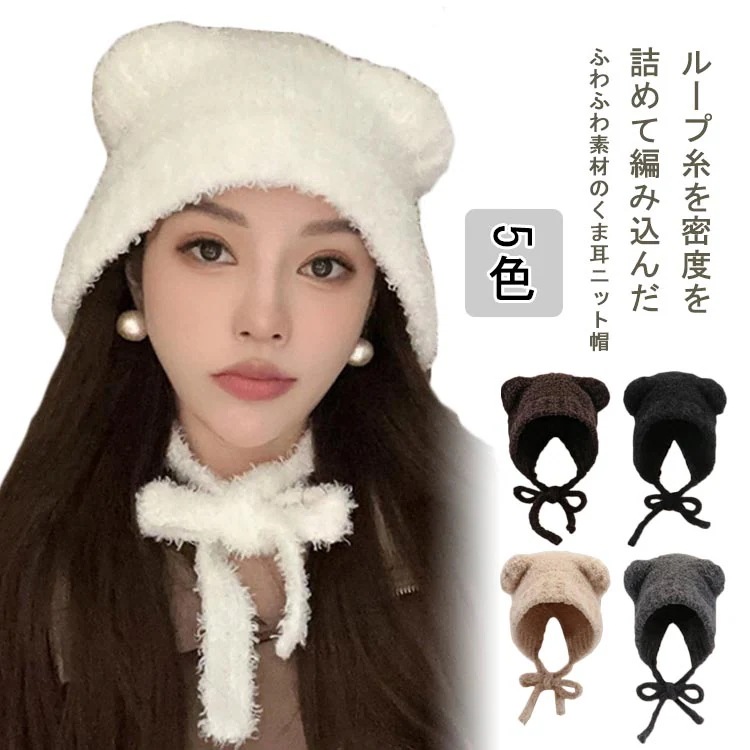 ニット帽 レディース くま耳 クマ耳 イヤーカバー ニットキャップ 冬 厚手 耳あて ふわふわ もこもこ ハット 帽子 あったか 保温 ループ糸 スリット ローゲージ ざっくり 伸縮性 防寒 アウトド