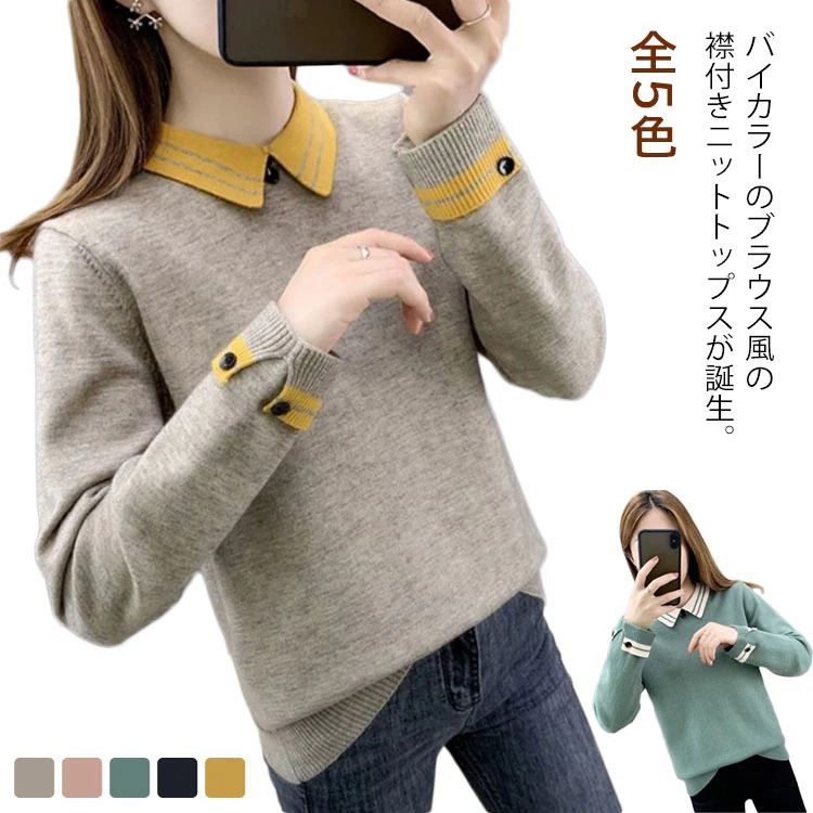 ニットトップス 襟付き ニット 長袖 バイカラー セーター トップス レディース 配色 プルオーバー 柔らかい 秋冬 おしゃれ かわいい