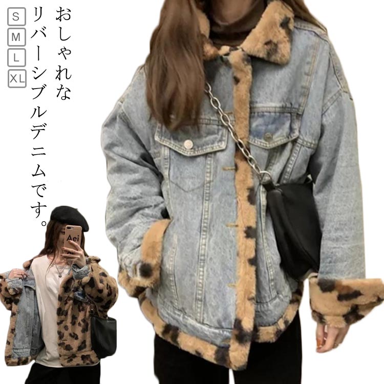 リバーシブル ボア ブルゾン デニムジャケット レディース 長袖 ボアジャケット Gジャン コート ボアブルゾン カジュアルジャケット レオパード柄 ブルー おしゃれ BF系 秋冬 S M L XL