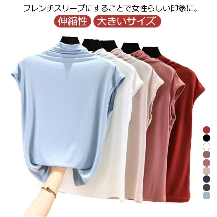 Tシャツ トップス ノースリーブ tシャツ フレンチ ハイネック ゆったり カジュアル レディース トップス 無地 大きいサイズ 春 夏 インナー ゴルフ 伸縮性 カットソー タートルネック シンプル