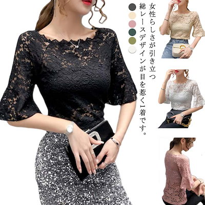 レーストップス フレア袖 レディース トップス ブラウス 花柄 総レース tシャツ 半袖 シアートップス 半袖Tシャツ シースルー トップス 春夏 フェミニン 20代 30代 40代 S M L XL