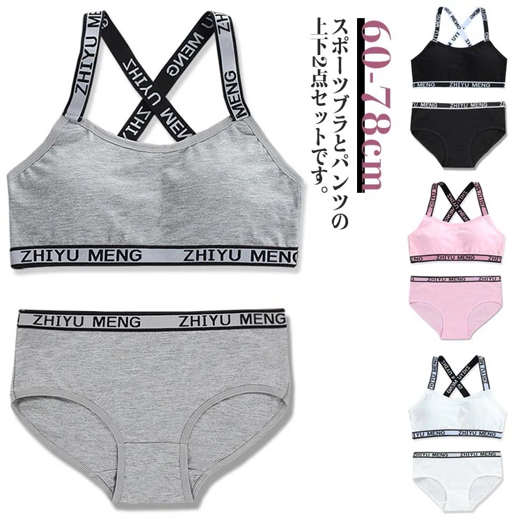 ジュニア向け 下着セット 子供 キッズ スポーツブラ ショーツ 2点セット カップ付き レディース 女の子 子供用下着 肌着 12才~16才 リブ英字ロゴ 無地 インナー アンダーウェア スポブラ シ