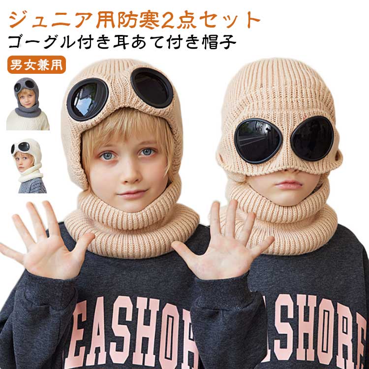 新作 2点セット ニット帽 子ども 帽子 ネックウォーマー 子供 男の子 女の子 4-10歳 キッズ 耳あて付き帽子 耳当て ゴーグル付き ジュニア 裏起毛 冬 秋冬 暖かい 保温 あったか 厚手 防