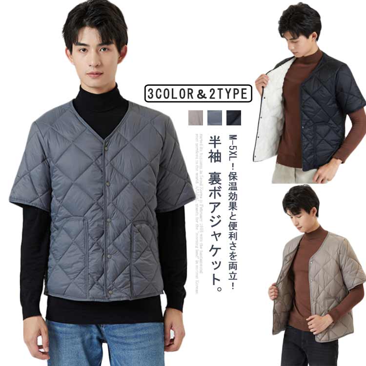 半袖ジャケット 中綿ジャケット メンズ ダウン風ジャケット 裏ボア 裏起毛 軽量 シンプル 無地 ポケット付き Vネック 保温 暖かい あったか インナー カーディガン 寒さ対策 中綿ベスト 仕事 部