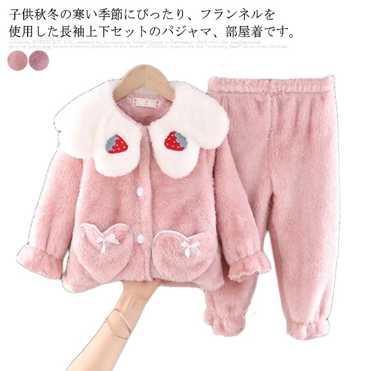 キッズ 長袖 ルームウエア パジャマ 可愛い いちご柄 部屋着 ボア 女の子 モコモコ 前開き 裏起毛 秋 冬 上下セット 寝巻き パジャマ ベビー 赤ちゃん 厚手 長ズボン セットアップ 防寒 かわ