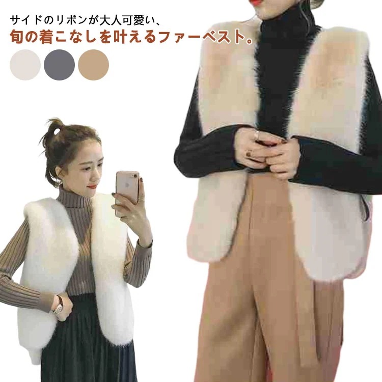 ファーベスト ショート ベスト ジレ レディース フェイクファーベスト 前開き サイドリボン ファー 羽織り アウター ジャケットコート Vネック ノースリーブ ふわふわ もこもこ 無地 大きいサイズ