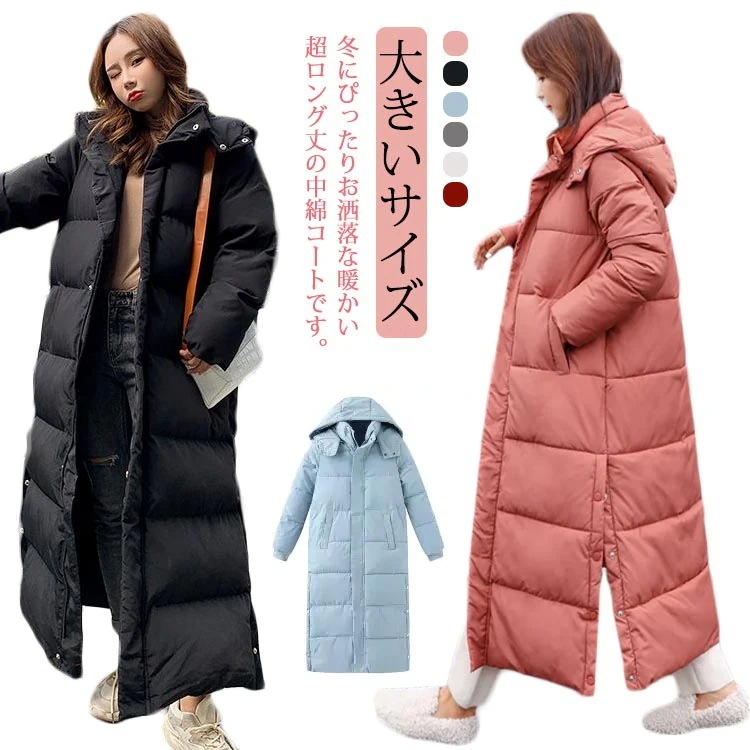 ロング アウター レディース 中綿 コート 暖か ダウン フェイクダウン ベンチコート スタンドカラー フード サイドスリット スナップボタン ダウンコート ロングコート 大きいサイズ 体型カバー ハ