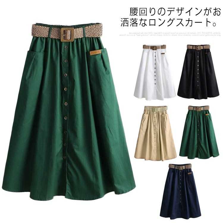 ロングスカート ミモレ丈 レディース 韓国ファッション 綿 ウエストゴム ボトムス ハイウエスト ポケットあり スリット スカート スカート Aラインスカート コットン 大きいサイズ フレアスカート
