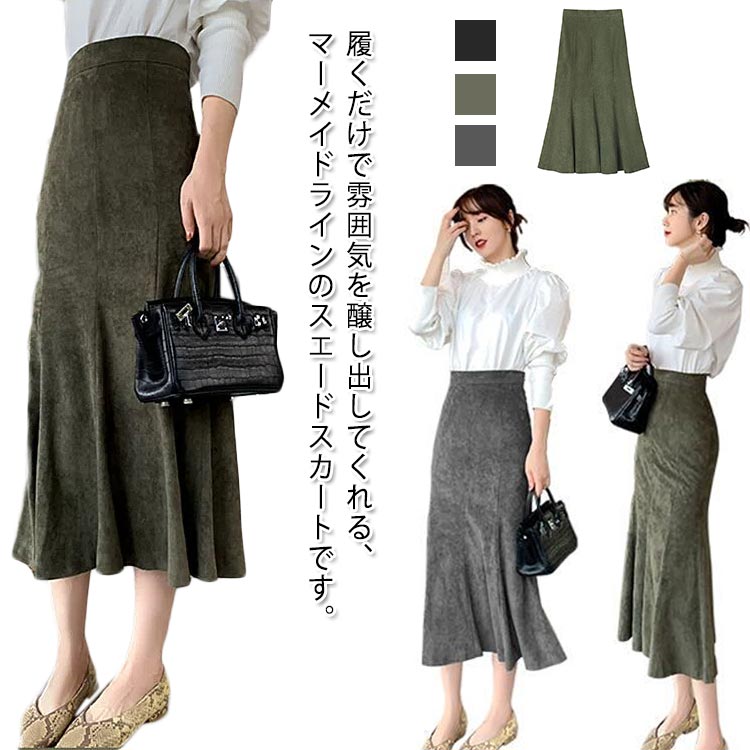 フェイクスエード スカート ロングスカート マーメイドスカート フレアスカート レディース 春夏 秋 黒 韓国 ハイウエスト ミモレ丈 きれいめ おしゃれ 大人 エレガント オフィス S M L XL