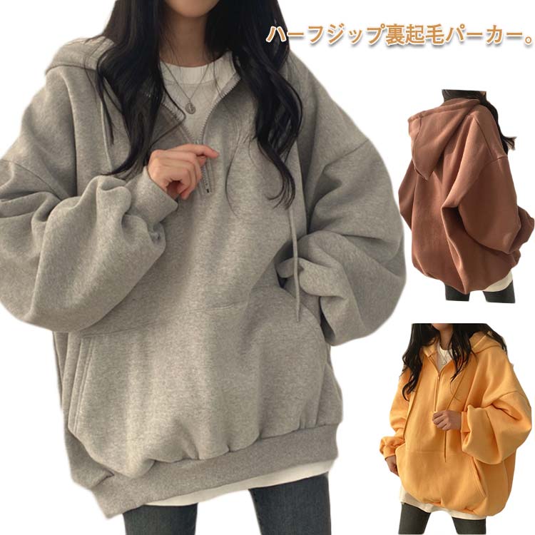 パーカー レディース ハーフジップ 裏起毛パーカー 長袖 トップス ボリュームスリーブ スウェット フード付き 無地 裏起毛 防寒 あったか 韓国ファッション ゆったり 体型カバー オーバーサイズ 薄
