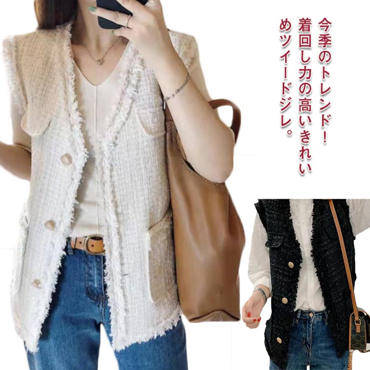 ベスト ジレ レディース ツイード ツイードベスト 秋冬 前開きベスト Vネック ノースリーブ ジャケット ミドル丈 羽織り 袖なし レイヤード 重ね着 アウター かわいい おしゃれ 韓国ファッション