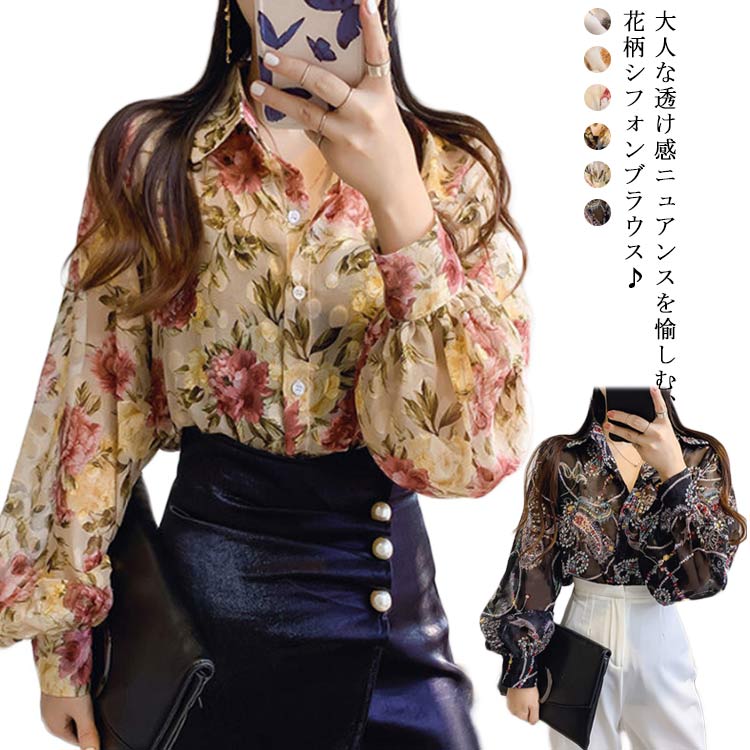 送料無料 シースルー 花柄ブラウス シアーブラウス 長袖 レディース シャツ トップス 長袖 ボリューム袖 透け感 ふんわり バルーン ギャザー シフォン 花柄 フラワー シアー シースルー 長袖シャ