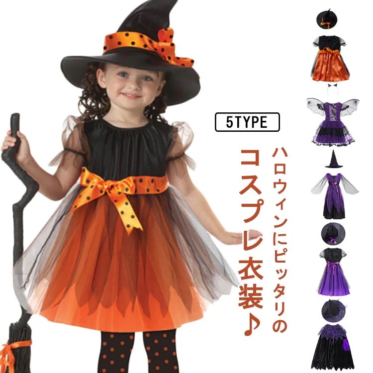 ハロウィン コスプレ 女の子 衣装 魔女 子供 コスプレ 仮装 キッズ コスチューム かぼちゃ 魔女っ子 ワンピース ハット ウィッチ 魔法使い コウモリ 悪魔 カボチャ 洋服 変装 cosplay