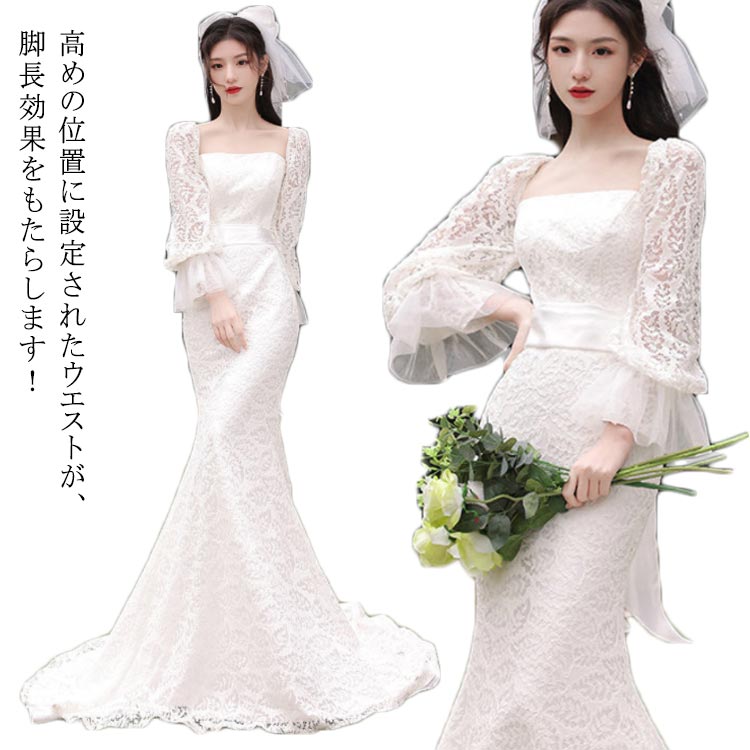 高品質 総レースドレス ウェディングドレス エンパイアライン マーメイドライン ロングドレス スレンダー レース 長袖 袖あり ワンピース 結婚式 二次会 披露宴 前撮り 後撮り ビーチフォト 二次会