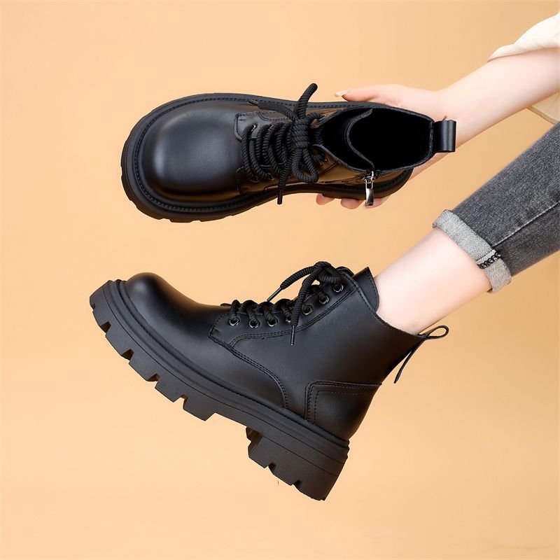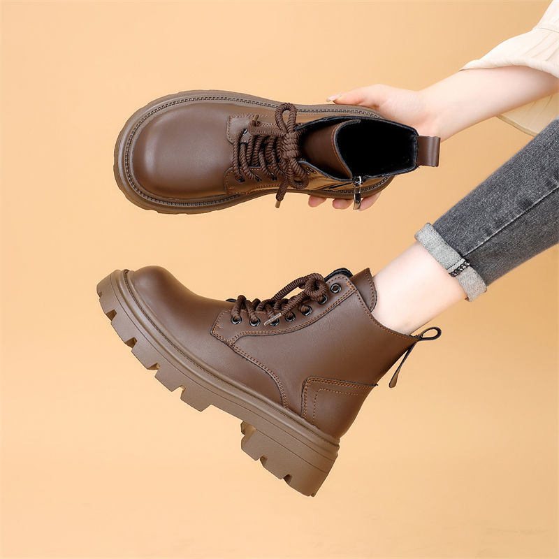 韓国ファッション ショートブーツ 真ソフトレザーレトロマーチンブーツ女性2024秋冬新型厚底爆発モデル英倫高加絨毯短ブーツショート