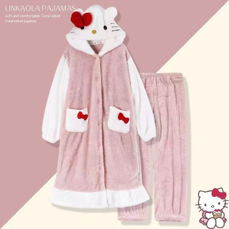 着ぐるみパジャマ キャラクター ハローキティ スリープウェア ベルベット 厚手 バスローブ かわいい 冬用 ワンピース スリーピングローブ ロング セット 韓国ファッション