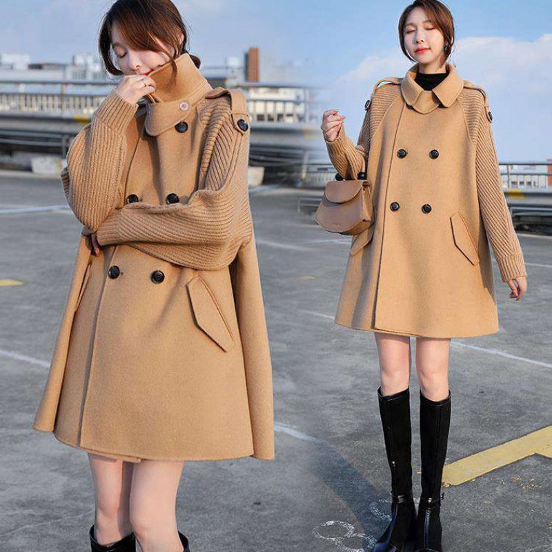 チェコート レディース 秋冬 40代 チェコート ニット切り替え 黒 ミディアム丈ラシャコート 厚手オーバー ゆったりアウター 着痩せ オシャレ大人
