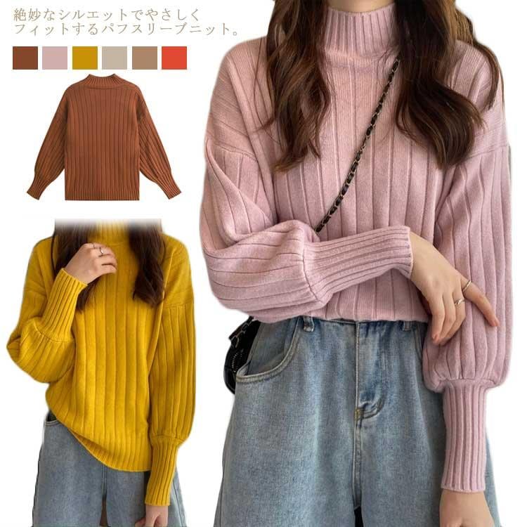 入荷 リブニット レディース ニットセーター 厚手 長袖 プチック モックネック パフスリーブ バルーンスリーブ ドロップショルダー リブ