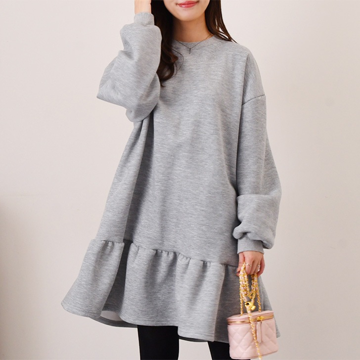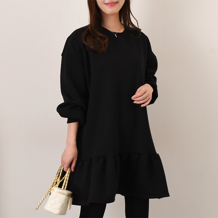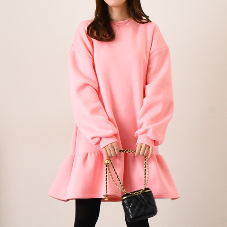 リアル スタイル裏起毛スウェット裾フリルミニ丈ワンピース レディース 長袖 秋 冬 ゆったり 大きめ きれいめ カジュアル あったか 暖かい 防寒 可愛い ガーリー スエット 無地 韓国ファッション ミニワンピース