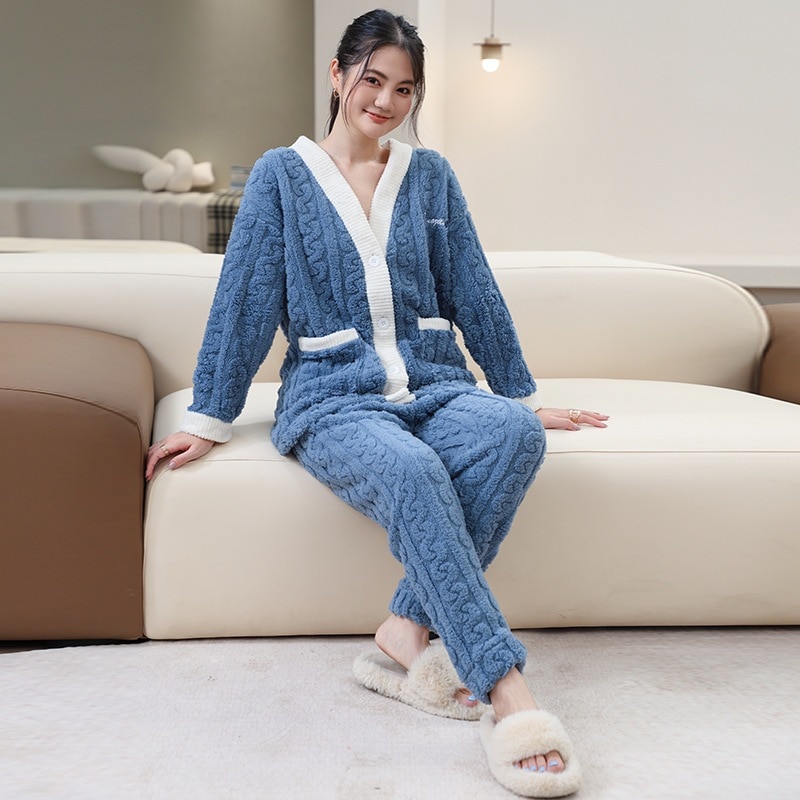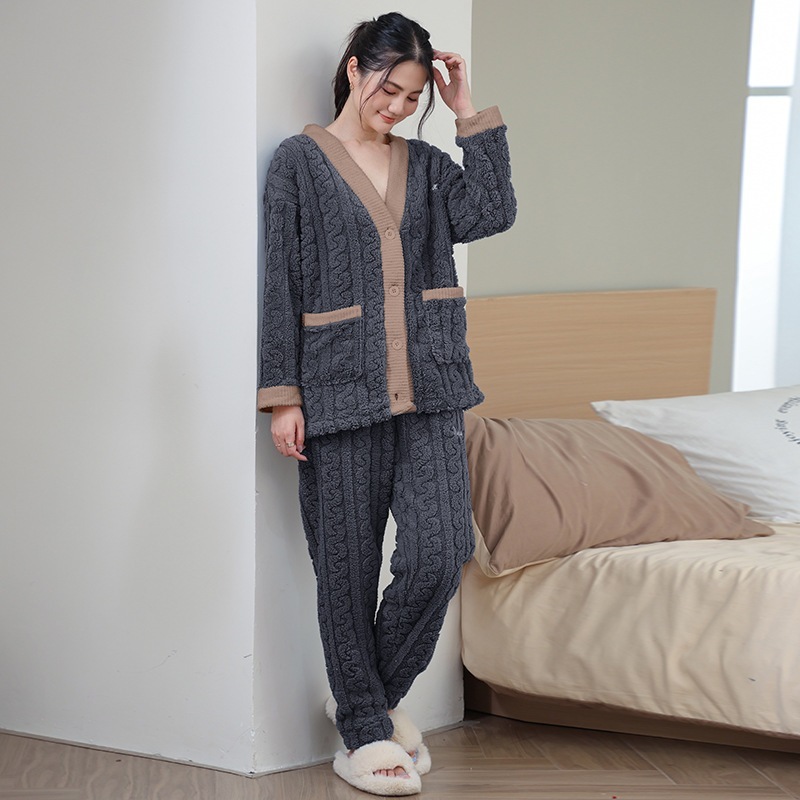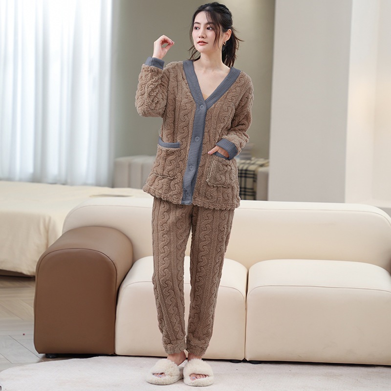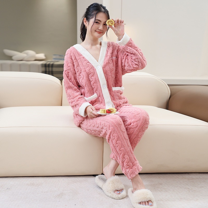 サンゴのベルベットのパジャマ冬の日韓女性の厚いポケット付きカジュアルな家のパジャマのカーディガンの甘い妹のゆるいスーツ