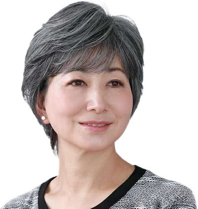 中高年フルウィッグ 大きめ ミセス レディース ショートヘア かつら 白髪 自然 パーマ ふんわり ボブ 斜め前髪 軽量 快適 おしゃれ(ダークグレイヘア, 普通サイズ)
