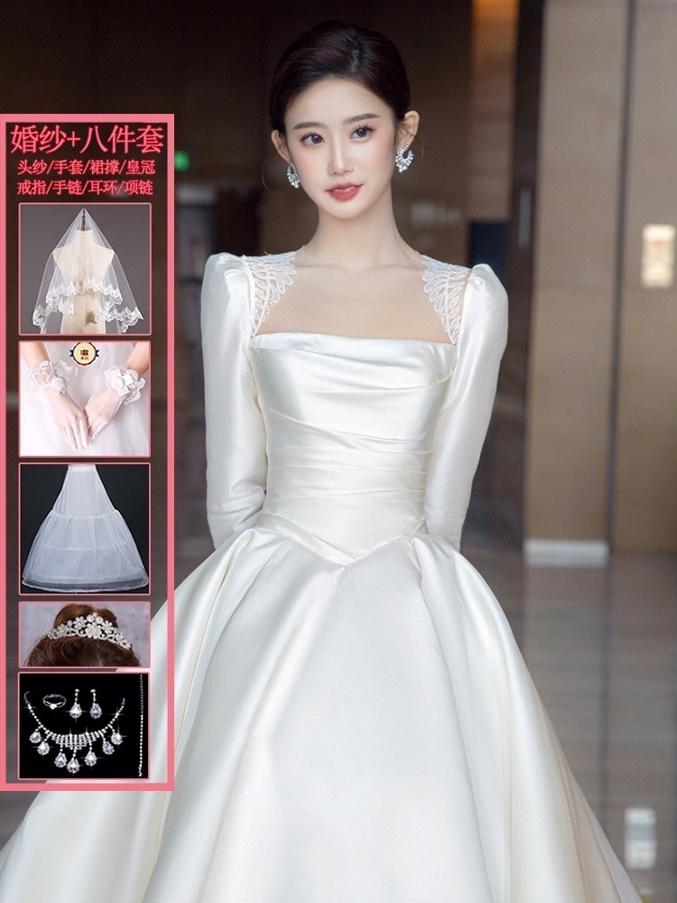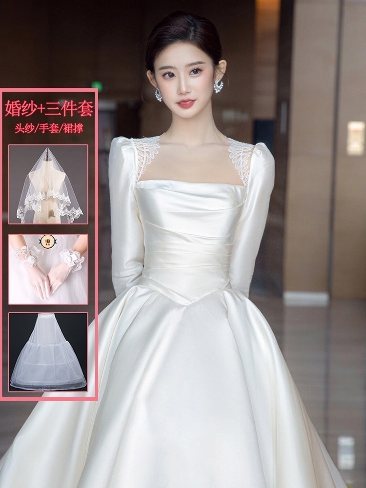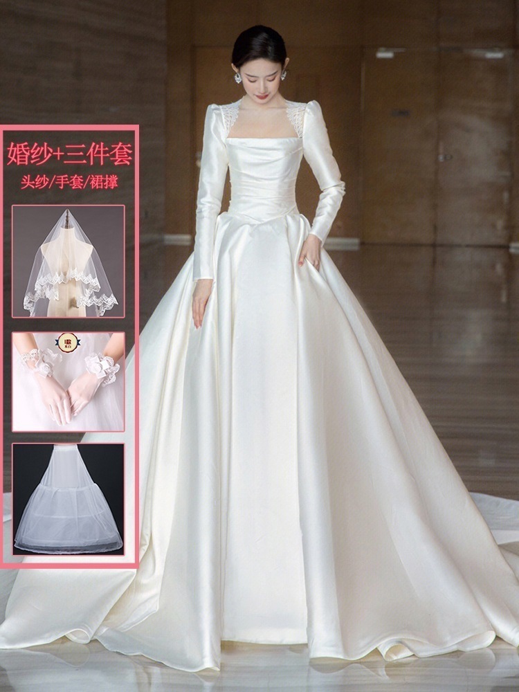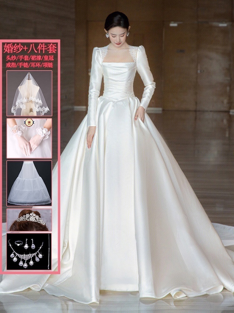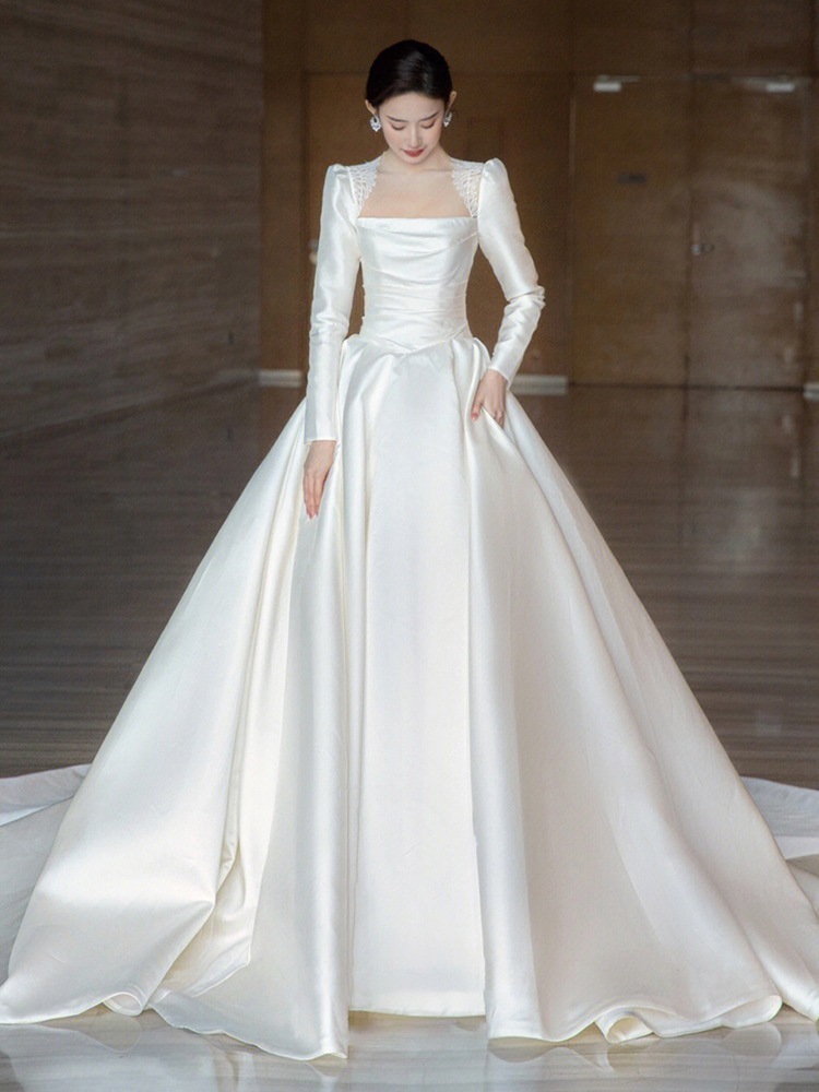 サテン ウェディングドレス 2025 ブライダル メイン糸 小さい フレンチ レトロ 質感 ウェルカム糸 長袖 冬