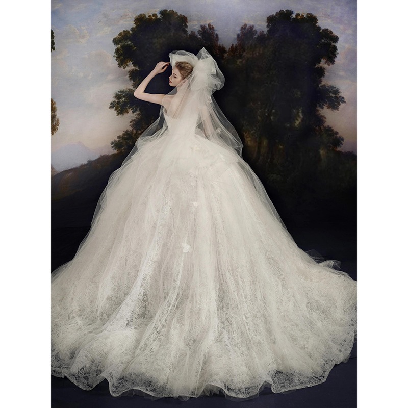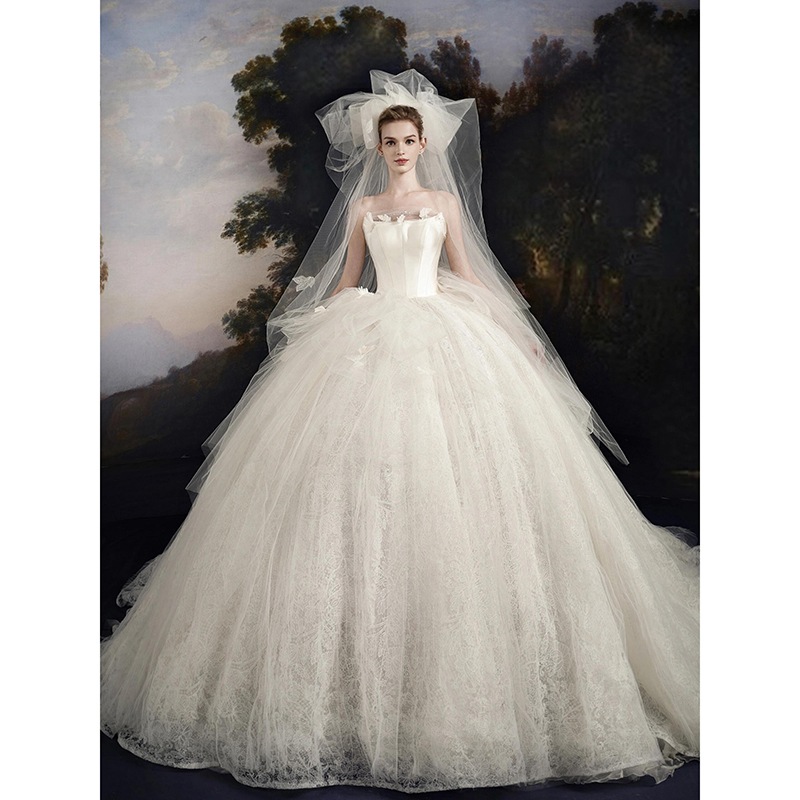 ストラップレスライトウェディングドレス2025花嫁プチ主糸生地重工業大きいサイズロングテール秋冬