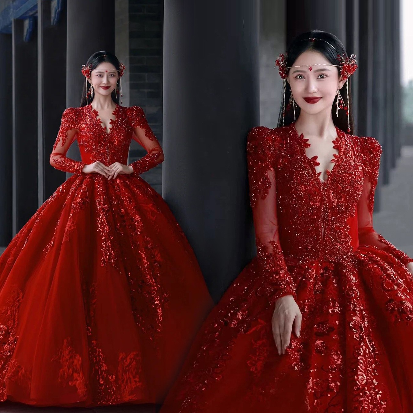 ブリリアントスパークリング長袖ブライダルレッド冬ウェディングドレス乾杯ドレッシングガウン