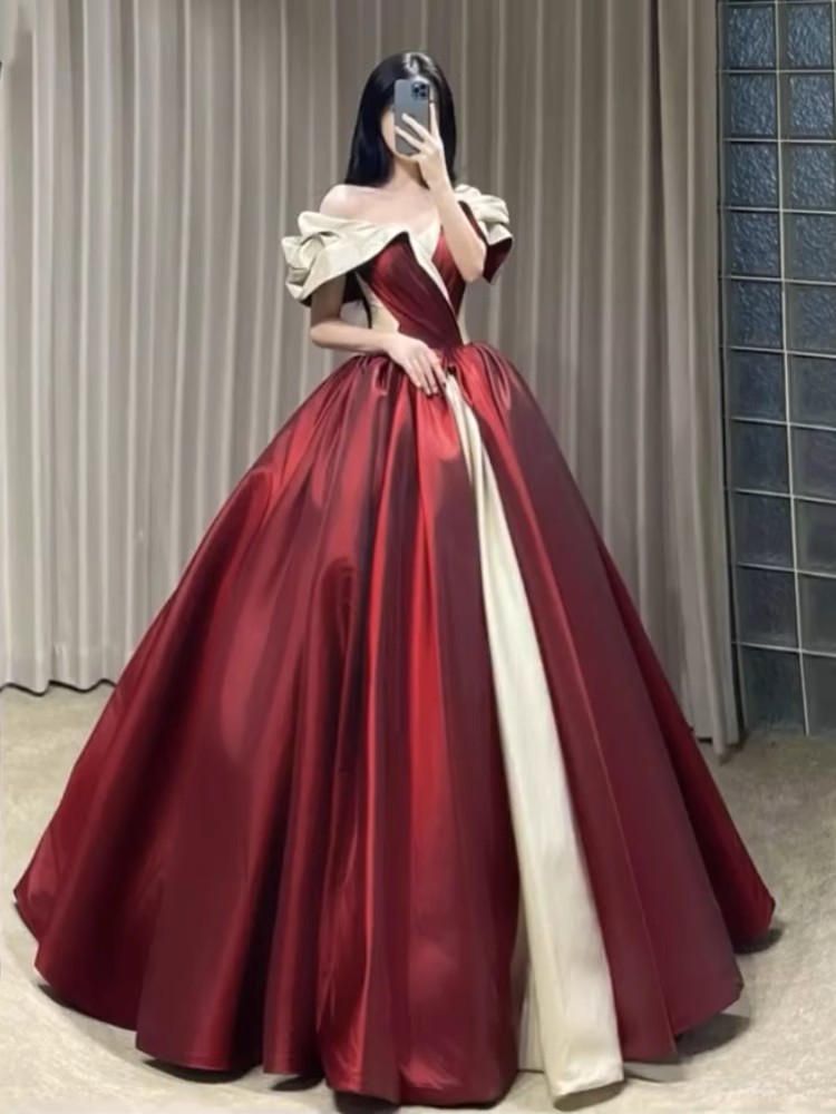 ワンショルダーレッドドレス 2025 エレガントでスリムで大きなスイングでステージパフォーマンス向け花嫁即位ディナープリンセスチュチュ