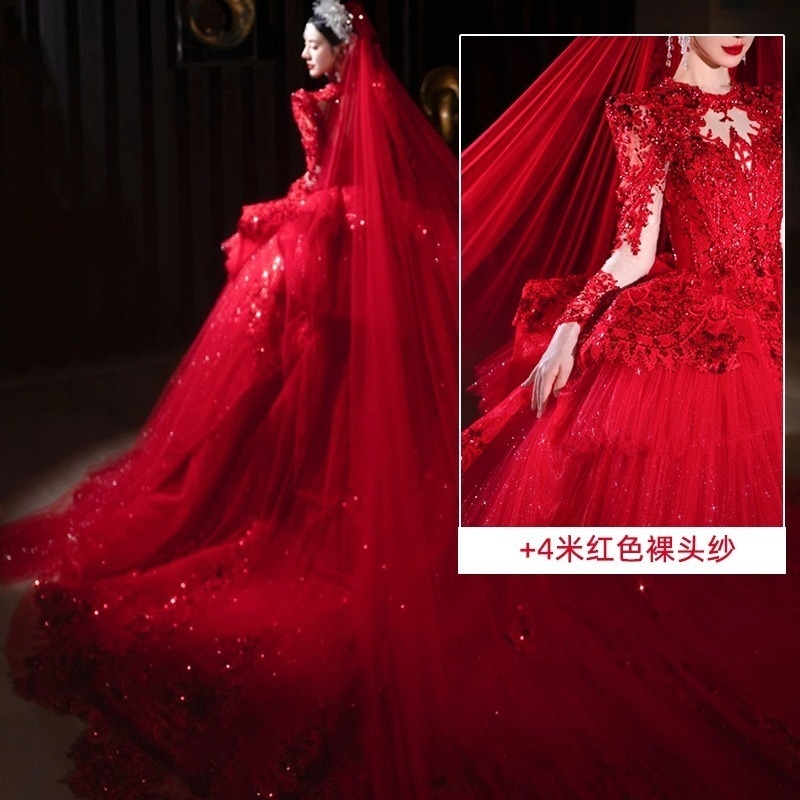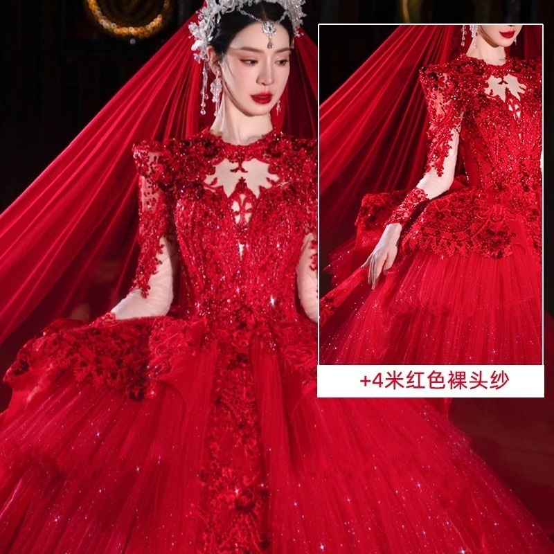 レッドメインウェディングドレス2025新花嫁ビッグテール冬重工業レトロスタイルシニアスモールロングスリーブ