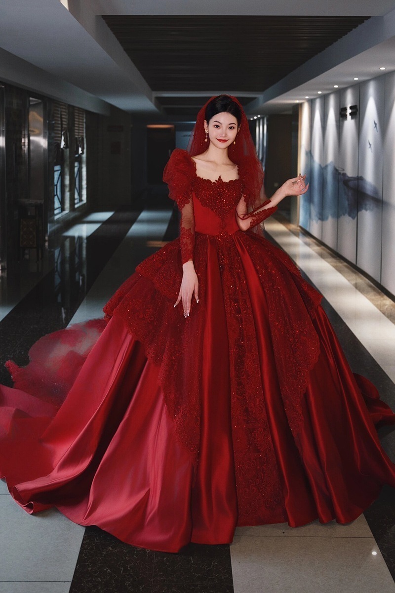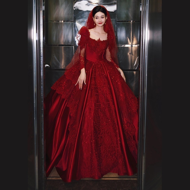赤いウェディングドレス 2025年新花嫁 感 ビッグテール 小宮殿風主糸 長袖