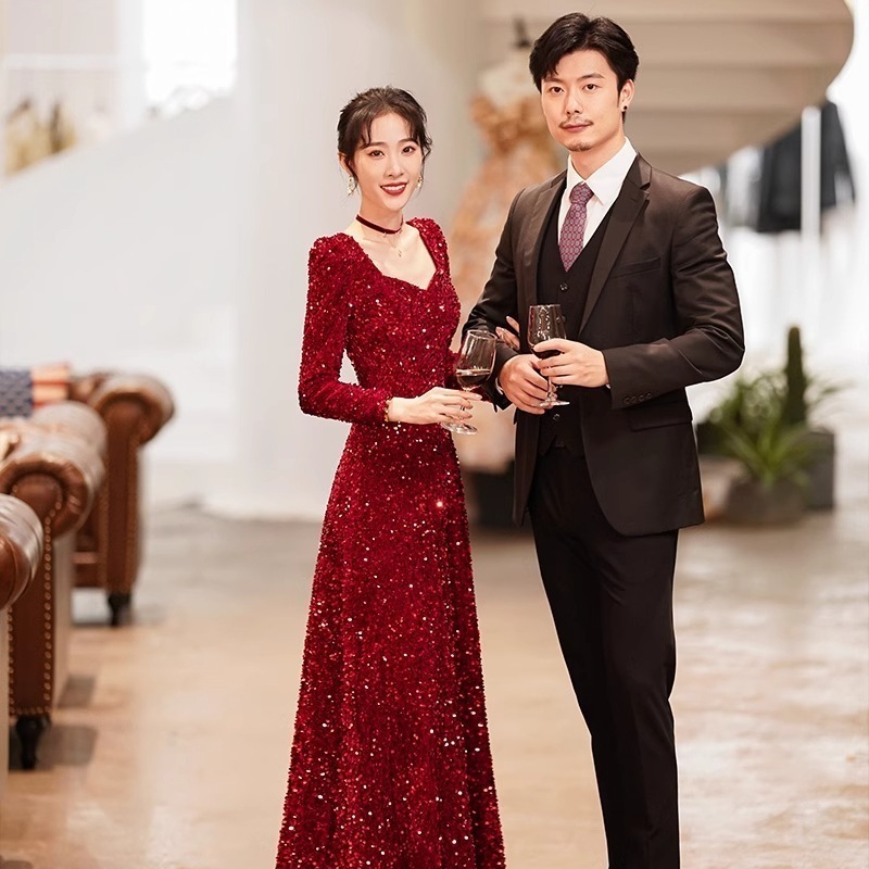赤い乾杯ドレス花嫁スパンコール結婚式披露宴の帰りの婚約ドレス小柄な気質長い秋