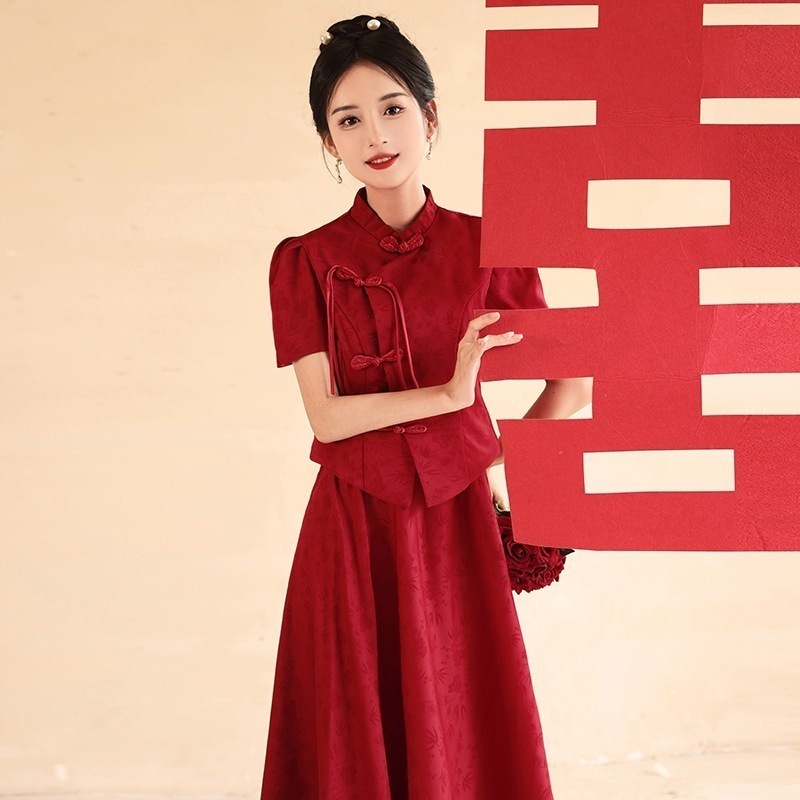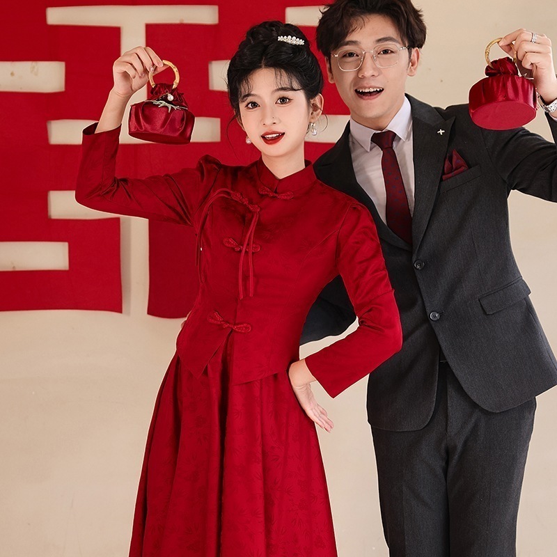 式チャイナドレス乾杯ドレス花嫁長袖赤いウェディングドレスツーピースドレス婚約ドレス