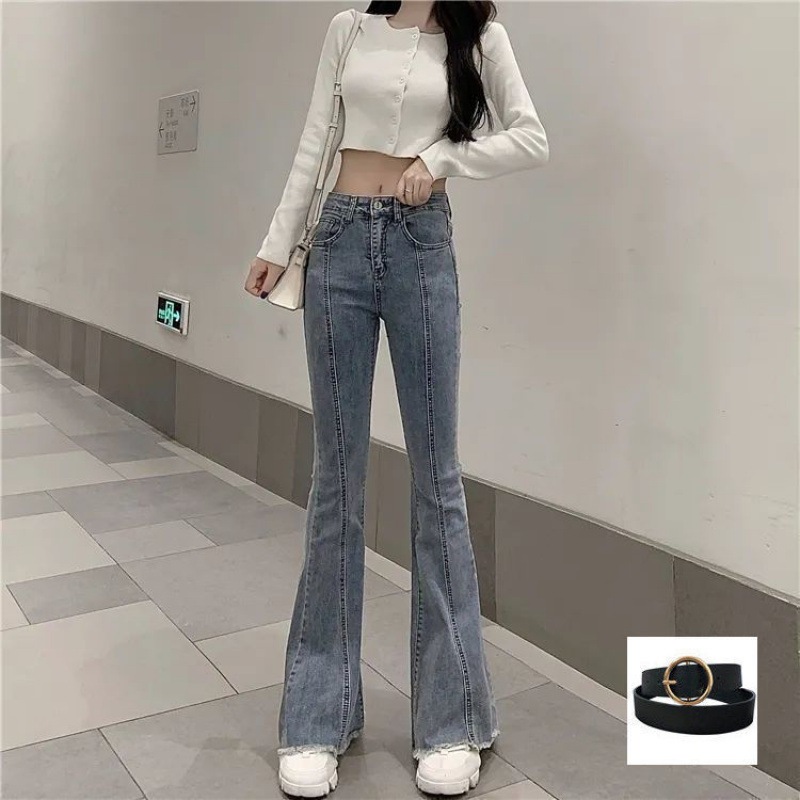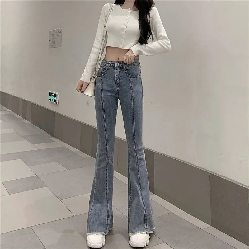 新 2025 生エッジハイウエストジーンズ女性のスリムフィットマイクロフレアパンツスリムパンツ春と秋の多彩なシックなパンツ